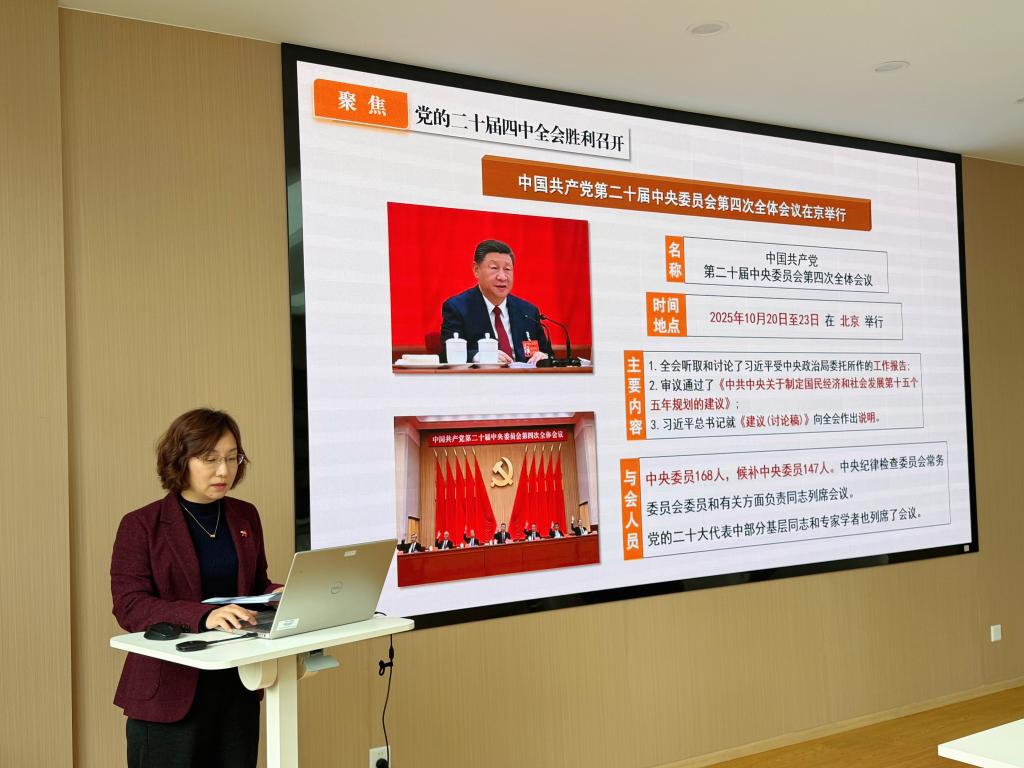 李旸以《深入学习贯彻党的二十届四中全会精神,向着全面推进中国式现代化阔步前行》为题讲授党课,为中心组和支部党员进行理论辅导。她强调了党的二十届四中全会的重大意义和“十四五”时期我国发展取得的重大成就,深入阐述了“十五五”时期的重要地位、指导思想、重大原则以及主要目标,要求大家学习好贯彻好全会精神。她对学院工作提出指导性意见:科学制定“十五五”规划,聚焦国家战略,明确发展定位,结合学院实际,主动融入学校的发展战略;集中做好学生就业工作,关注重点群体,加大帮扶力度;推进基层党建规范化、法制化、科学化建设,构建一融双高新生态。